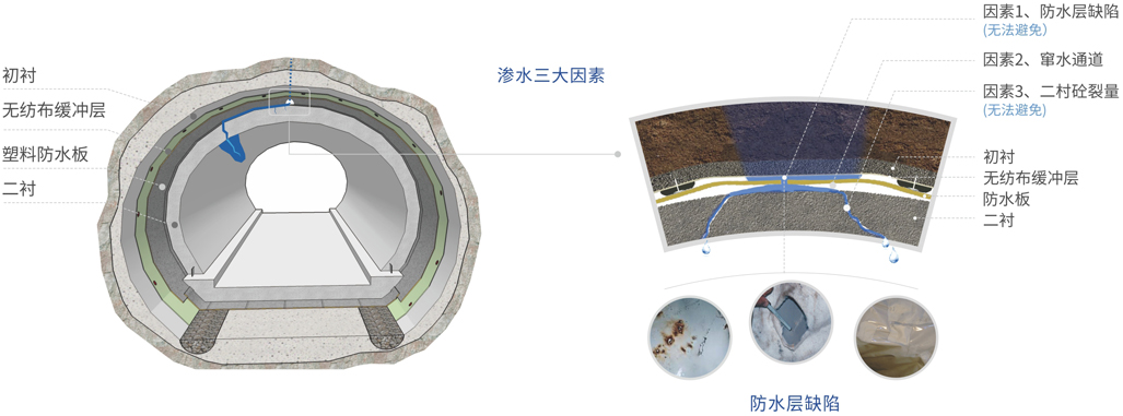 傳統(tǒng)的礦山法隧道基本上以塑料板(EVA、PVC、ECB等)為主體材料進(jìn)行防水設(shè)防,在國內(nèi)現(xiàn)有的施工條件和組織形式下,滲漏很普遍,嚴(yán)重影響行車安全和結(jié)構(gòu)壽命,給后期維護(hù)帶來沉重的負(fù)擔(dān)。