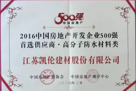 凱倫股份是一家集防水材料研發(fā)、制造、銷售及施工服務(wù)于一體的國家高新技術(shù)企業(yè)。先后獲得“中國防水行業(yè)質(zhì)量提升示范企業(yè)”、“中國房地產(chǎn)500強供應(yīng)商”(中國房地產(chǎn)業(yè)協(xié)會頒發(fā))、“江蘇省優(yōu)秀企業(yè)”(江蘇省民營企業(yè)家協(xié)會頒發(fā))等榮譽稱號。